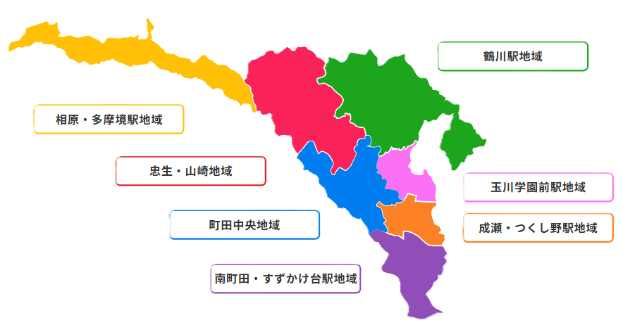 鶴川地域:鶴川、能ヶ谷、三輪町、三輪緑山、金井町、金井、大蔵町、野津田町、小野路町、真光寺、真光寺町、広袴、広袴町、薬師台