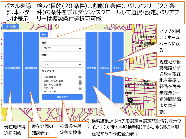 検索:目的(20条件)、地域(8条件)、バリアフリー(23条件)の各条件をプルダウン/スクロールして選択・設定。バリアフリーは複数条件選択可可能。検索条件設定後は、パネル下部の「検索実行」を行う⇒検索条件の合致した施設(マーカー)が表示される。